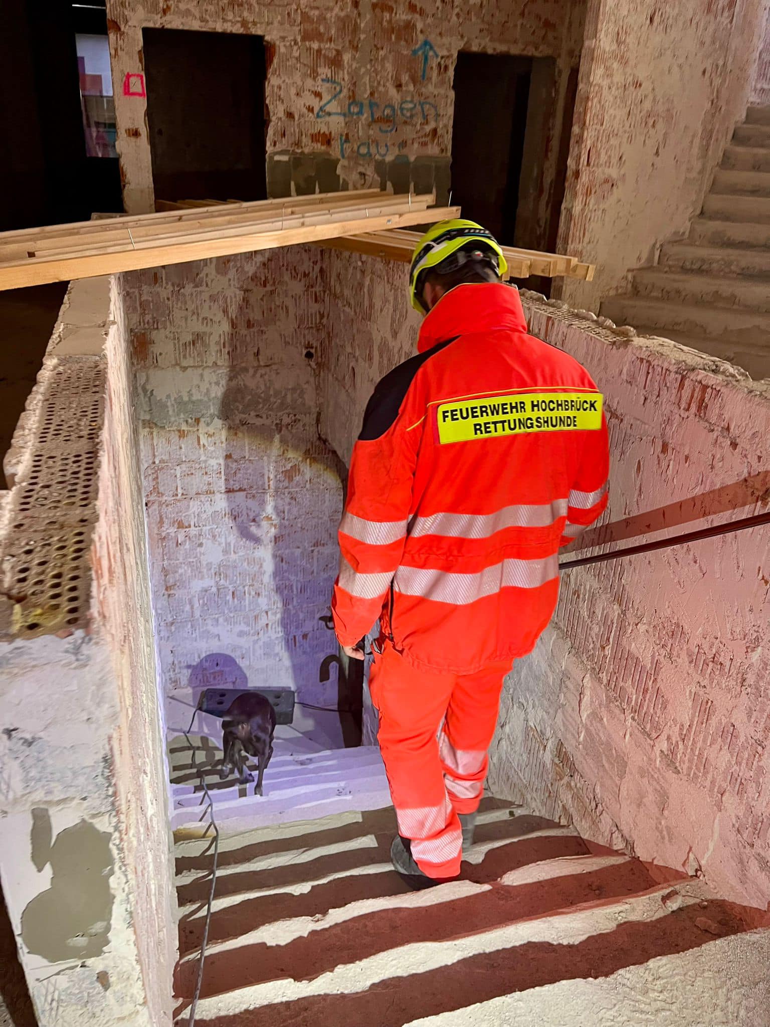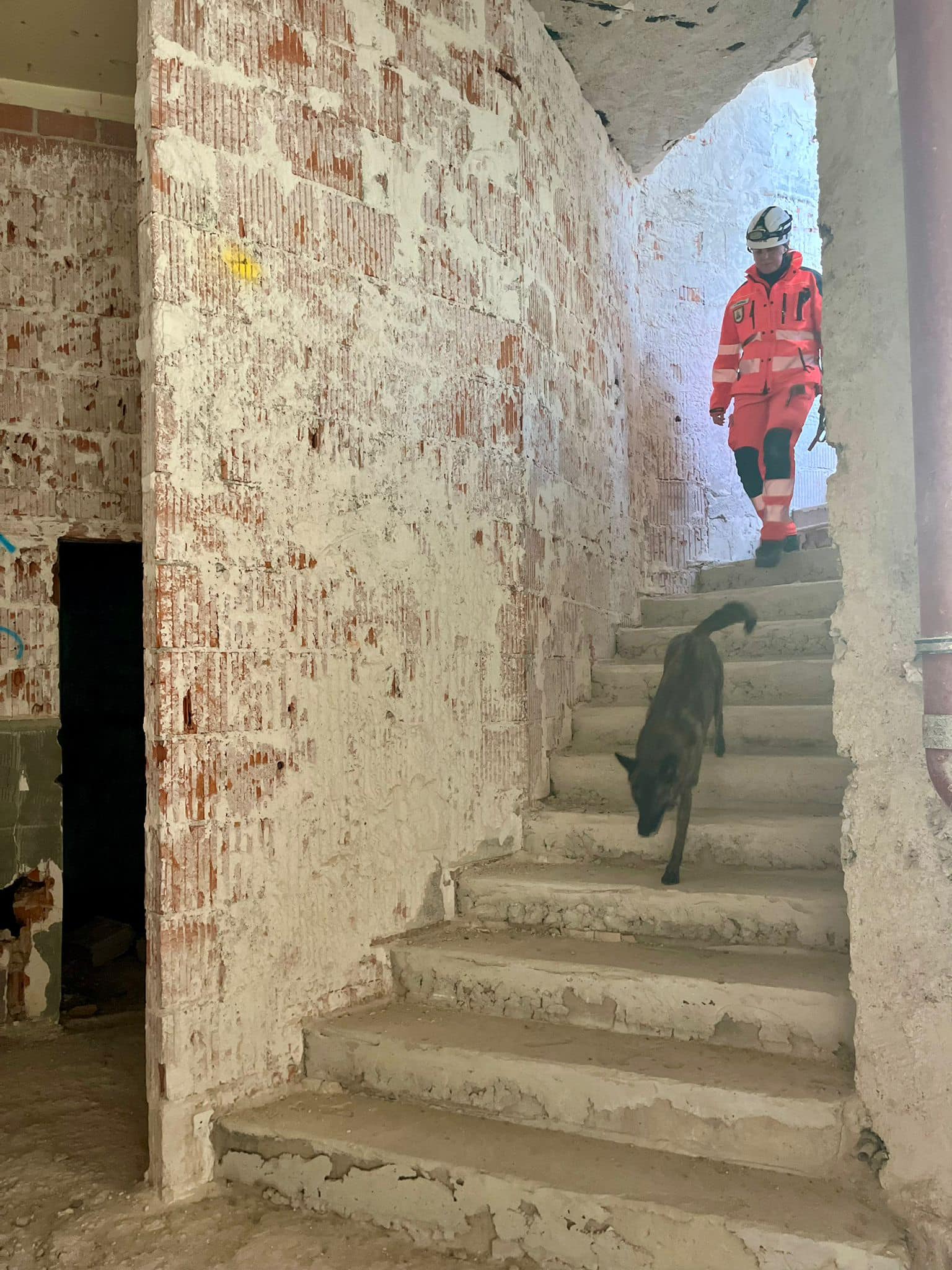 „Beim heutigen Training ging es einmal nur um die Hunde unserer Ausbilder. Unter der Leitung der beiden Trümmer-Ausbilder, Andrea und Fabian, trainierten heute unsere Ausbilder zusammen mit ihren Hunden in einem Abbruchhaus. Gerade für die Ausbildung der Trümmerhunde sind solche Trainingsmöglichkeiten immens wichtig, um die Beweglichkeit in schwierigen Lagen, aber auch die Führigkeit des Hundes, sowie die Teamarbeit zu intensivieren.“